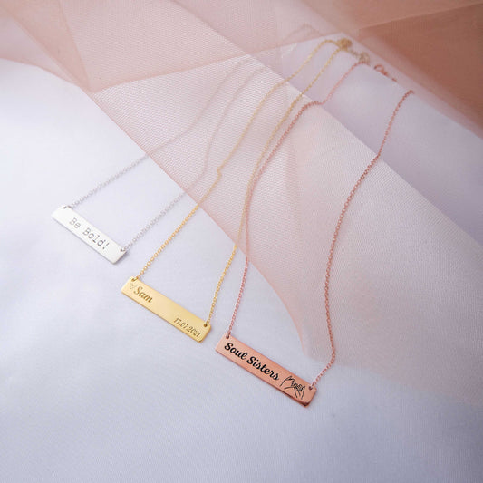 Custom Engraved Bar Necklace and Dainty Thin Gold