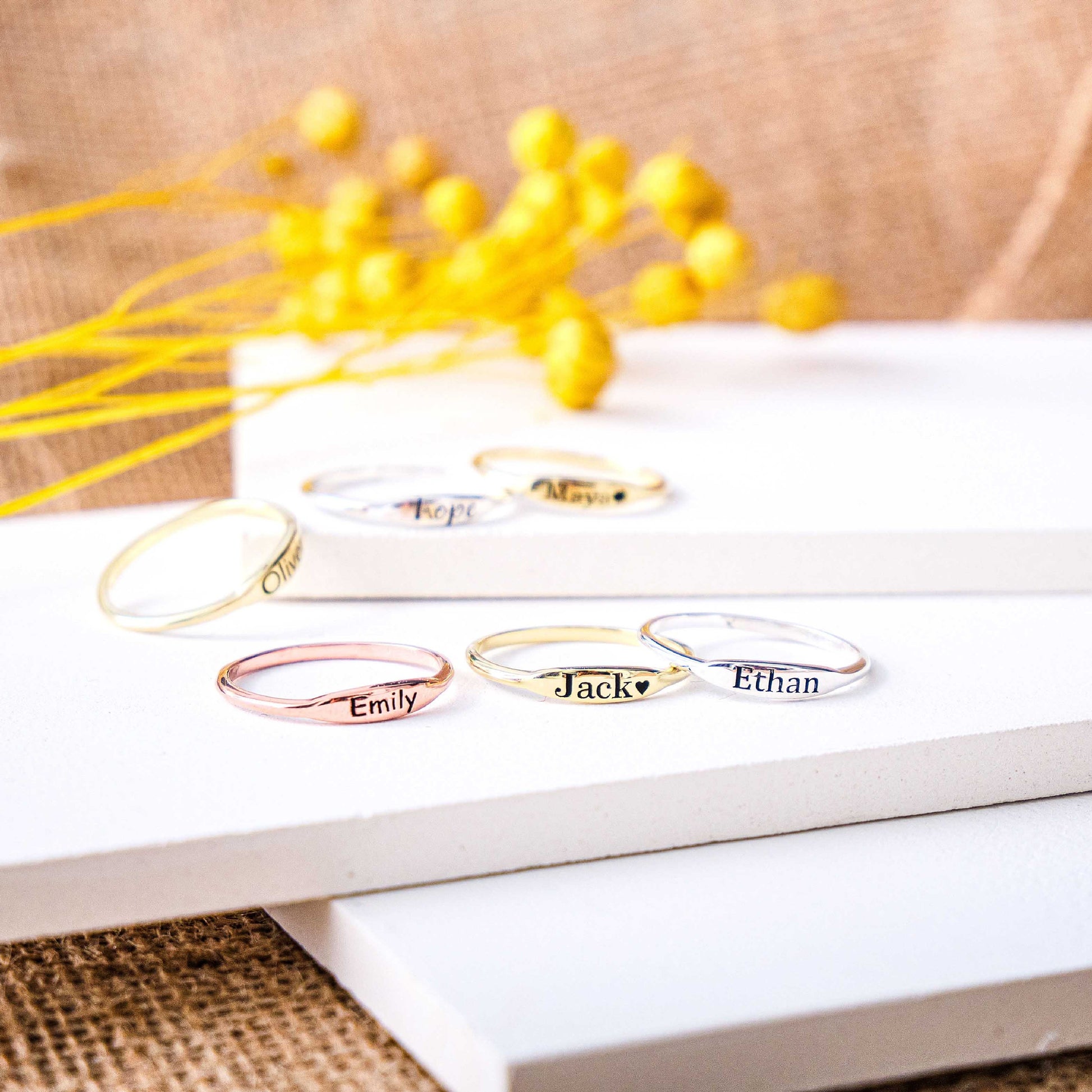 • Choose from various designs such as heart initial rings, 14k gold name rings, or even custom word rings to create a piece that reflects your personality